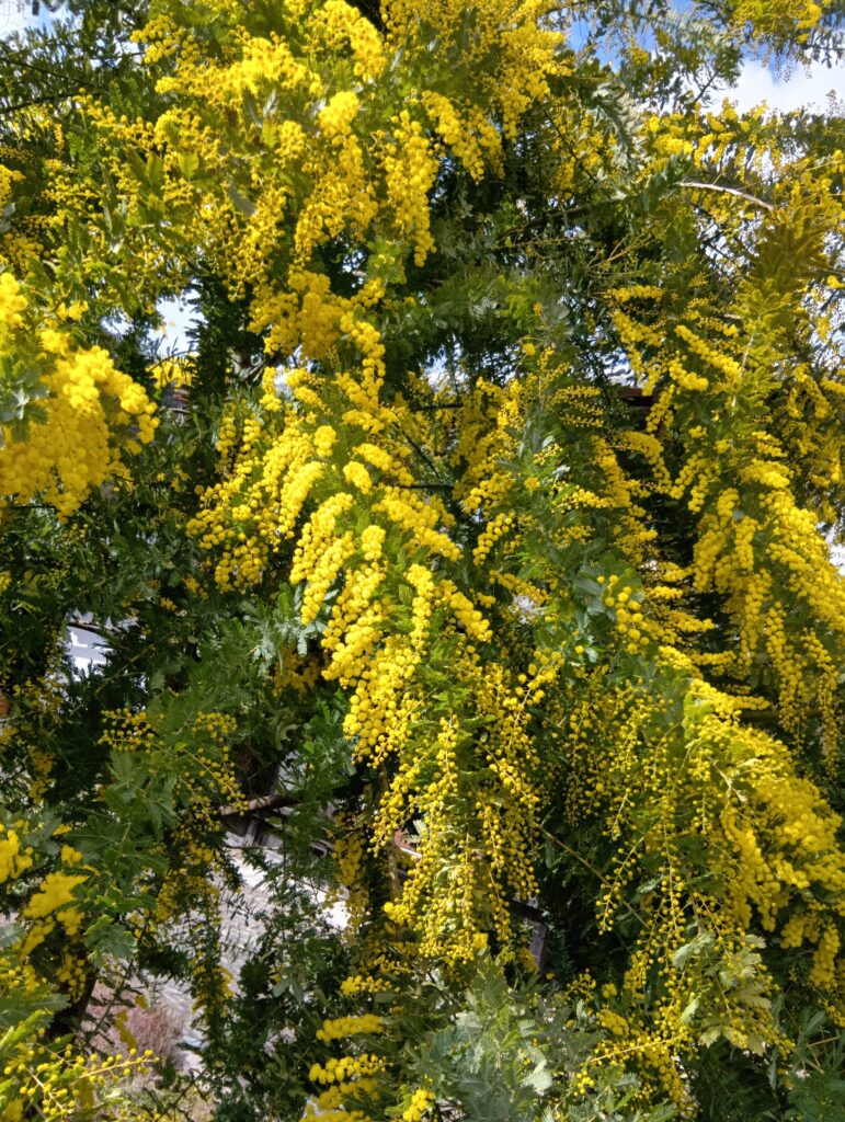 庭のミモザが美しく咲いています。残念ながらミモザの花は香りが無い?ようです。